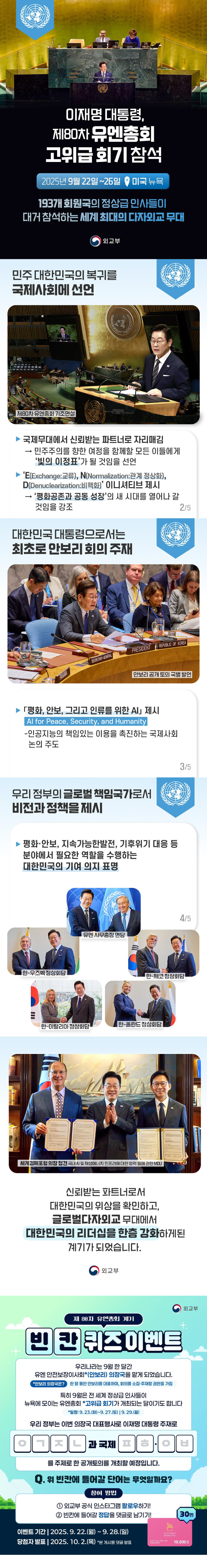 119-2 외교부-25-007 제80차 유엔총회 고위급회기 참석 및 안보리 의장국 수임 - 정상, 제80차 유엔총회 고위급회기 참석 계기 △기조연설(9.23) △「인공지능과 국제평화ㆍ안보」 제하 안보리 공개토의 주재(9.24) △유엔 사무총장 및 4개국 정상과의 양자회담